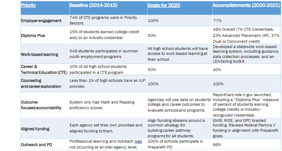 Outcome-focused accountability is one PrepareRI's key priorities, so data is assembled every year on student outcomes related to PrepareRI’s work.
